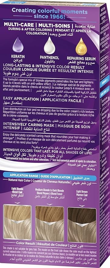 لون أشقر فضي بارد نقي، بدرجة أنيقة تعكس الضوء وتمنحك مظهرًا جذابًا ومتجددًا، مناسب للبشرة الفاتحة والمتوسطة ومحبات الدرجات الباردة.