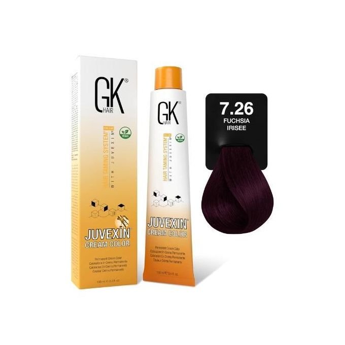 صبغة جلوبال GK Hair رقم 7.26 هي صبغة شعر احترافية تعطي لون فوشيا بنفسجي قوي مائل للأحمر مع قاعدة أشقر متوسط. هذا اللون يعتبر من الألوان العصرية الجريئة في مجموعة Irisee التي تضم درجات بنفسجية وفوشيا لامعة.
