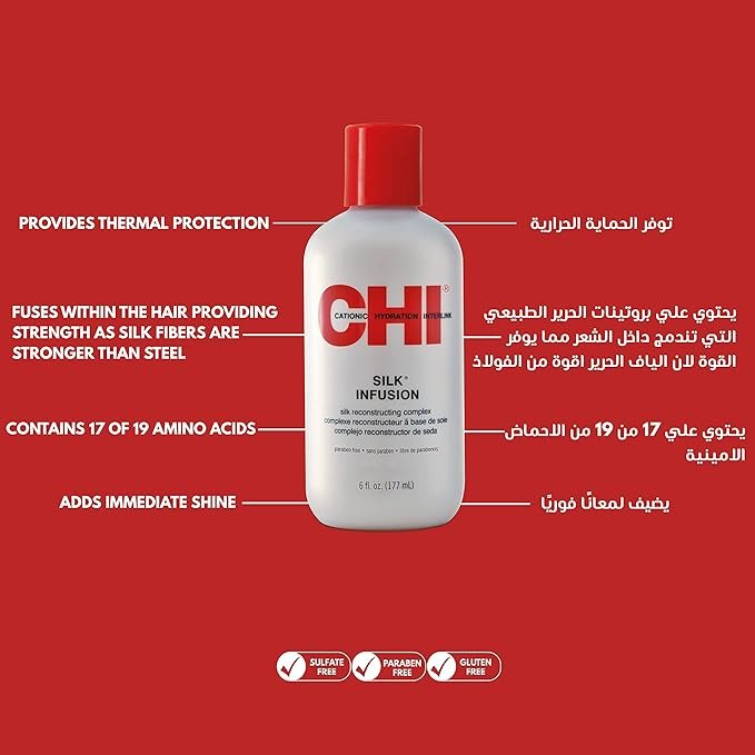 سيروم CHI Infra Silk Infusion 177 مل هو علاج/سيروم للشعر يُترك على الشعر يوفر ترطيبًا عميقًا، تغذية، حماية من الحرارة، ولمعانًا حريريًا — مناسب لمعظم أنواع الشعر وخاصةً الجاف والمتضرّر، ويمكن استخدامه قبل أو بعد التسريح كتطبيق يومي أو دعم إضافي.