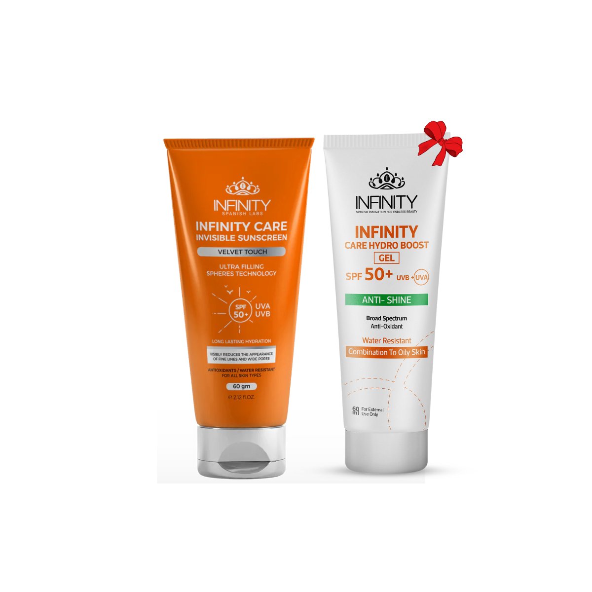 هذه مجموعة حماية من الشمس فائقة الأداء من Infinity Care تجمع بين منتجين مكمّلين للحماية اليومية من أشعة الشمس مع تحكم إضافي في لمعان البشرة — مناسبين خصوصًا للبشرة الدهنية والمختلطة أو لمن يريد واقيًا خفيفًا غير دهني تحت المكياج أو بمفرده.