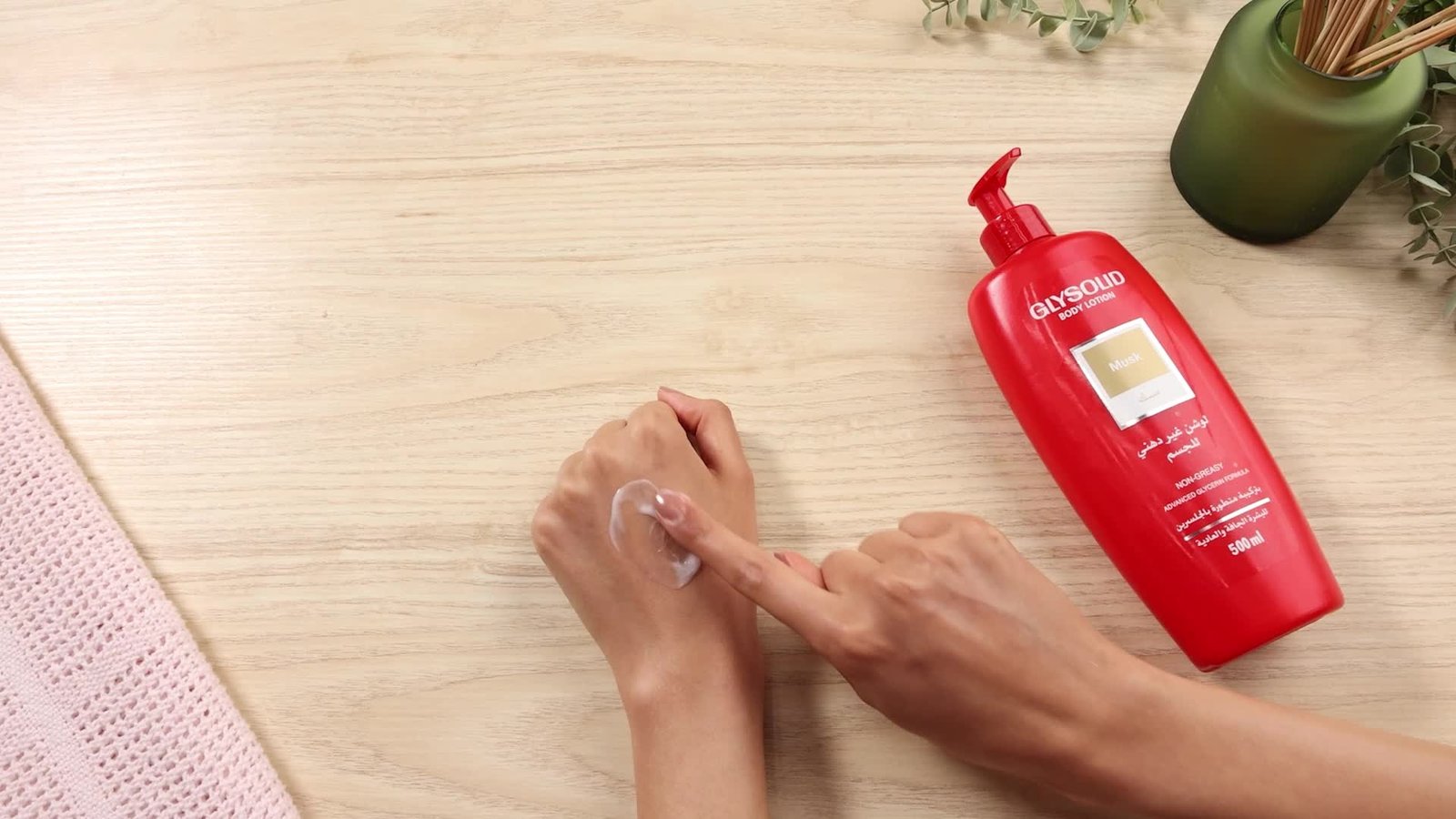 لوشن جليسوليد برائحة المسك يوفر ترطيبًا مكثفًا وطويل الأمد للبشرة، ويتركها ناعمة ومرنة مع عبير المسك الفاخر يدوم طوال اليوم. تركيبته الخفيفة تمتص بسرعة دون أن تترك أي أثر دهني، مما يجعله مثاليًا للاستخدام اليومي لجميع أنواع البشرة.