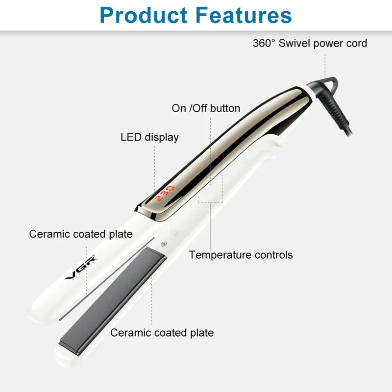 مكواة VGR V-550 هي مكواة فرد شعر احترافية تُستخدم لفرد الشعر أو عمل تموجات بسهولة، وتتميز بتقنيات تسخين حديثة وشاشة عرض لدرجة الحرارة.